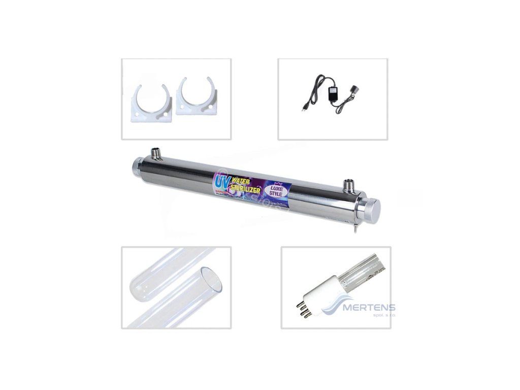 -je zariadenie určené na dezinfekciu vody pomocou UV-C žiarenia (254 nm). UV žiarenie narúša DNA mikroorganizmov a účinne eliminuje baktérie, vírusy a ďalšie patogény vo vode bez použitia chemikálií. Zariadenie je vhodné ako posledný stupeň úpravy pitnej vody v domácnostiach alebo menších prevádzkach.